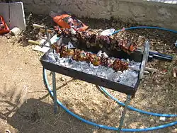 Mezedes is a large selection of dishes with small helpings of varied foods, brought to the table as a progression of tastes and textures. The meal begins with black and green olives, tahini, skordalia (potato and garlic dip), humus, taramosalata (fish roe dip), and tzatziki / cacık (ttalattouri in Cypriot), all served with chunks of fresh bread and a bowl of mixed salad. Some of the more unusual meze dishes include octopus in red wine, snails in tomato sauce, brains with pickled capers, samarella (salted dried meat), quails, pickled quail eggs, tongue, kappari pickles (capers), and moungra (pickled cauliflower). Bunches of greens, some raw, some dressed with lemon juice and salt, are a basic feature of the meze table. The meal continues with fish, grilled halloumi cheese, lountza (smoked pork tenderloin), keftedes (minced meatballs), sheftalia (pork rissoles), and loukaniko (pork sausages). Hot grilled meats – kebabs, lamb chops, chicken – may be served toward the end. The dessert is usually fresh fruit or glyka – traditional sugar-preserved fruits and nuts.[1]