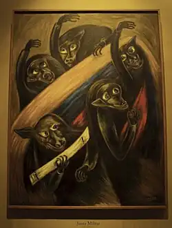Jose Orozco's works, which Arango studied at the Escuela Nacional de Bellas Artes, also significantly affected her, influencing her future techniques and style.[7] In El Tren de la Muerte (The Train of Death), the dead bodies of massacred people are depicted inside a train car; the brush strokes and lines are dramatic and the faces, all unidentifiable, have formed horrific expressions. This is similar to Orozco’s The Trench, which depicts unidentifiable figures engaged in battle; the style of the brush strokes and lines are similar, and Orozco is trying to emphasize the anonymity of revolution and the destruction that it causes. Like Orozco, Arango draws attention to the lives being ruined by a corrupt Colombian government.