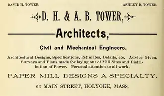 Doing business as D. H. & A. B. Tower, brothers David Horatio Tower (March 7, 1832 – December 22, 1907)[2] and Ashley Bemis Tower (June 26, 1847 – July 8, 1901)[3] were internationally known American architects, civil and mechanical engineers based in Holyoke, Massachusetts, who designed mills and factories in the United States from Maine to California as well as abroad, including in Canada, Mexico, Germany, Brazil, the United Kingdom, India, China, Japan, and Australia.[3][4][5][6] By the time of its dissolution, the firm was described by one contemporary account as "the largest firm of paper mill architects in the country at that time";[7] its files reportedly contained more than 8,000 architectural plans for sites, mill machinery, and waterpower improvements.[4][8][9]