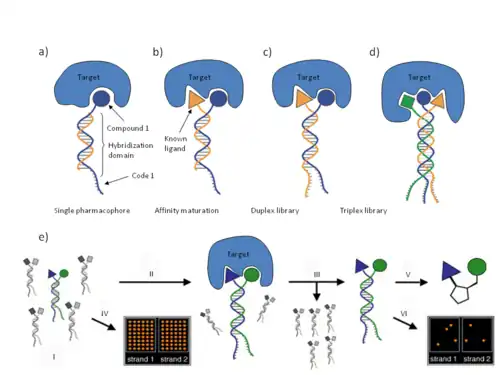 The beginning of the millennium saw the introduction of several independent developments in DEL technology. These technologies can be classified under two general categories: non-evolution-based and evolution-based DEL technologies capable of molecular evolution. The first category benefits from the ability to use off the shelf reagents and therefore enables rather straightforward library generation. Hits can be identified by DNA sequencing, however DNA translation and therefore molecular evolution is not feasible by these methods. The split and pool approaches developed by researchers at Praecis Pharmaceuticals (now owned by GlaxoSmithKline), Nuevolution (Copenhagen, Denmark) and encoded self- assembled chemical (ESAC) technology developed in the laboratory of Prof D. Neri (Institute of Pharmaceutical Science, Zurich, Switzerland) fall under this category. ESAC technology sets itself apart being a combinatorial self-assembling approach which resembles fragment based hit discovery (Fig 1b). Here DNA annealing enables discrete building block combinations to be sampled, but no chemical reaction takes place between them. Examples of evolution-based DEL technologies are DNA-routing developed by Prof. D.R. Halpin and Prof. P.B. Harbury (Stanford University, Stanford, CA), DNA-templated synthesis developed by Prof. D. Liu (Harvard University, Cambridge, MA) and commercialized by Ensemble Therapeutics (Cambridge, MA) and YoctoReactor technology.[10] developed and commercialized by Vipergen (Copenhagen, Denmark). These technologies are described in further detail below. DNA-templated synthesis and YoctoReactor technology require the prior conjugation of chemical building blocks (BB) to a DNA oligonucleotide tag before library assembly, therefore more upfront work is required before library assembly. Furthermore, the DNA tagged BBs enable the generation of a genetic code for synthesized compounds and artificial translation of the genetic code is possible: That is the BB's can be recalled by the PCR-amplified genetic code, and the library compounds can be regenerated. This, in turn, enables the principle of Darwinian natural selection and evolution to be applied to small molecule selection in direct analogy to biological display systems; through rounds of selection, amplification and translation.
