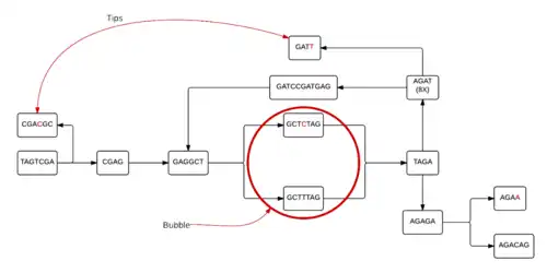 When a graph is formed from sequenced data, the read errors form tips and bubbles. A tip is where an error occurred during the sequencing process and has caused the graph to end prematurely and includes both correct and incorrect k-mers. A bubble is also formed when an error occurs during the sequence reading process; however, wherever the error happens, there is a path for the k-mer reads to reconnect with the main graph and continue as though nothing had ever happened. When there are tips and bubbles present in a de Bruijn graph formed from the data, they may be removed only if an error is what caused the tip or bubble to appear. When scientists are using a reference genome, they can quickly and easily tell where tips are located by comparing the graph of the reference genome and the graph of the sequence. If there is not a reference genome, tips are eliminated by tracing the branches backward until a point of ambiguity is found. Tips are then removed only if the branch containing the tip is shorter than a set threshold length.[3] The process of removing bubbles is slightly more complicated. The first thing that needs done is to identify the beginning of the bubble. From there, each path from the beginning of the bubble is followed until the point of reconnection. The point of reconnection can be different for each path. Since there can be paths of various lengths from the beginning node, the path which has a lower coverage is removed.[3]