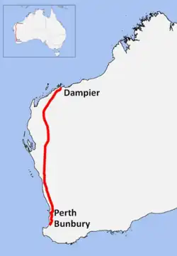As a single trunkline it is 1,530 kilometres (950 mi) long,[4] extending from the Burrup Peninsula in the Pilbara region, to Bunbury in the south west of Western Australia. It supplies gas to industrial, commercial and residential customers in Perth and major regional centres along the pipeline route. It is covered by Western Australian pipeline licence PL-40. A number of lateral pipelines are connected to this pipeline, most of which are covered by separate licences, although PL-40 itself covers the main trunkline and some laterals totalling a length of 1,789 kilometres (1,112 mi).[2]