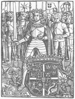 The reason that the kings of Denmark in the 14th century began displaying the cross banner in their coats of arms is unknown. Caspar Paludan-Müller (1873) suggested that it may reflect a banner sent by the pope to support the king during the Livonian Crusade.[13] Adolf Ditlev Jørgensen (1875) identifies the banner as that of the Knights Hospitaller, an order that had a presence in Denmark from the later 12th century.[8]