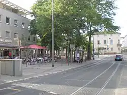The northernmost first is the town-centre, which is at Wartehalle, the central bus and tram stop. From this point southwards is the shopping street of Eberstadt, which runs up to the second notable point, the Modaubrücke, where the Heidelberger Landstraße crosses the River Modau, and the intersection of north–south and east–west roads is located. The Protestant church, first mentioned in 1379,[3]: 305ff marks the third point. It is built upon a hill, where it can be seen from all directions, making it a landmarks of Eberstadt.