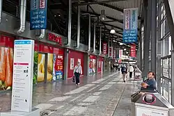 The station building was renovated from 1998 to 2002, requiring intensive conservation. The 94 metres long and 34 metres wide platform area has ten platform tracks and was renewed in 2005–2008 for approximately €31 million.[8] Lifts were installed on the passenger overpass over the platforms to connect with the platforms below, supplementing the stairs, so that the station was accessible for the handicapped for the first time. The elevated platform overpass was extended to accommodate a shopping centre in 2000 with finance from the city of Darmstadt; this also allows access to the district to the west, which is the location of the seat of the European Space Operations Centre, among other things.