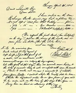 Seeking to find uses for his accumulated capital, Leavitt entered into several banking ventures. He was elected president of the Fulton Bank of New York City.[19] Later, in 1838, he became president of the American Exchange Bank, a large lending institution headquartered in Manhattan, with which he served for 16 years. During his tenure at American Exchange, there was a financial panic, during which European bondholders of the State of Illinois declared their intention to foreclose on the bonds issuer. "Grave fears were entertained that the bonds would not be paid", wrote The New York Times, "and several financiers had failed in placing them in the European market, but by pledging his own credit, Mr. Leavitt succeeded in creating a degree of confidence in the scheme, and it was a source of pride to him in after years that all the holders of the bonds eventually received both principal and interest."[11] To reassure the bondholders, Leavitt not only advanced his own funds, but traveled to England to meet jittery European stakeholders.[14]