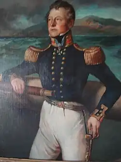 Joining the navy on HMS Ardent in 1801, he fought at Copenhagen that year and then in the West Indies on HMS Blenheim when the Peace of Amiens broke down in 1803.[1] He then served in HMS Centaur in 1805 and 1806 under its captain Sir Samuel Hood, fighting in the battle off Rochefort on 25 September 1806 and in its capture of the 50-gun Russian battleship Sevolod on 26 August 1808.[1] He was then appointed acting lieutenant on Ardent in April 1809 and during summer 1809 was captured and released by the Danes twice during the Gunboat War. He was confirmed as lieutenant in September 1809, continuing in Ardent right up to February 1811. He was then transferred to the brig HMS Hawk off France's northern coast, managing to bring out an armed brig and three store ships on 19 August 1811 when Hawk drove a convoy and its escort on shore near Barfleur,[1] though in a later attempt to cut two more brigs out of Barfleur harbour he was severely wounded and unable to serve again for almost a year.