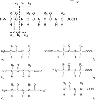 - ^ a b c Johnson, Richard S.; Martin, Stephen A.; Biemann, Klaus (December 1988). "Collision-induced fragmentation of (M + H)+ ions of peptides. Side chain specific sequence ions". International Journal of Mass Spectrometry and Ion Processes. 86: 137–154. Bibcode:1988IJMSI..86..137J. doi:10.1016/0168-1176(88)80060-0.