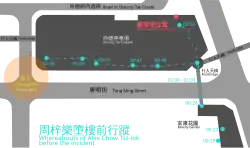 Cheng stated that Chow was last captured on footage at 01:01:39 while walking from the second floor to the third floor along the ramp.[27] He said that it is possible, based on Chow's walking pace, that Chow had walked 15 metres from the place where he was last captured on camera at 01:01:39 to the 1.2-metre-high wall where he fell eight seconds later.[53] He added that no one else had been captured by cameras on the third floor for seven seconds before the incident.[25] When asked whether Chow could have been attacked within the eight seconds, Cheng stated that there is no evidence that supports such a hypothesis.[51][53] He explained that it is difficult for someone who wants to ambush Chow to hide from being captured by the cameras as the cameras rotate randomly, adding that the culprit would have to calculate the exact time of Chow walking up to the third floor and complete the whole attack within eight seconds, which is difficult to accomplish.[51] He believes that it is impossible that someone could have attacked, lifted, and thrown Chow over the wall within the eight seconds.[27]