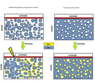 - ^ Parker, Joseph F.; Chervin, Christopher N.; Pala, Irina R.; Machler, Meinrad; Burz, Michael F.; Long, Jeffrey W.; Rolison, Debra R. (2017-04-28). "Rechargeable nickel–3D zinc batteries: An energy-dense, safer alternative to lithium-ion". Science. 356 (6336): 415–418. Bibcode:2017Sci...356..415P. doi:10.1126/science.aak9991. ISSN 0036-8075. PMID 28450638.