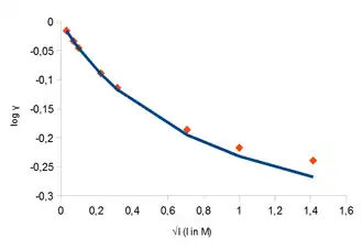 where I is the ionic strength and a0 is a parameter that represents the distance of closest approach of ions. For aqueous solutions at 25 °C A = 0.51 mol−1/2dm3/2 and B = 3.29 nm−1mol−1/2dm3/2[12]