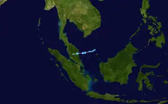 On 14 December 2021, the Japan Meteorological Agency (JMA)[nb 1] upgraded a westward-moving low-pressure area to a tropical depression.[20][21] The Joint Typhoon Warning Center (JTWC)[nb 2] began monitoring the system by the next day, noting the presence of a consolidated low-level circulation within the system.[23] The system's chances of developing into a tropical cyclone slowly increased,[23] and on 16 December at 17:30 UTC, the JTWC issued a Tropical Cyclone Formation Alert (TCFA) for the system despite the outflow of Typhoon Rai partially exposing the system's low-level circulation.[24] By 21:00 UTC, the JTWC upgraded the system to a tropical depression, assigning it the designation 29W as it continued over marginally favorable developmental conditions.[25] Shortly after, at 23:00 UTC, the depression made landfall north of the city of Kuantan in the state of Pahang, and began to weaken afterwards, prompting the JTWC to issue its final advisory on the system by the next day.[26] The JMA stopped monitoring the system on 17 December at 12:00 UTC.[27][28]