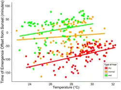 48. ^ a b Frick, W. F.; Stepanian, P. M.; Kelly, J. F.; Howard, K. W.; Kuster, C. M.; Kunz, T. H.; Chilson, P. B. (2012). "Climate and Weather Impact Timing of Emergence of Bats". PLOS ONE. 7 (8): e42737. Bibcode:2012PLoSO...742737F. doi:10.1371/journal.pone.0042737. PMC 3411708. PMID 22876331.