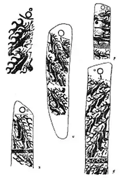 Depictions of weapons on Deer stones (Type I): long sword with scabbard, dagger with horned animal head and scabbard, sword with openwork scabbard, dagger with animal head and scabbard, dagger with pommel, knife with ring, knife with ring and sheath, lance with pennon, bows and quiver, hatchet, long-shaft socketed axe.[49][50]