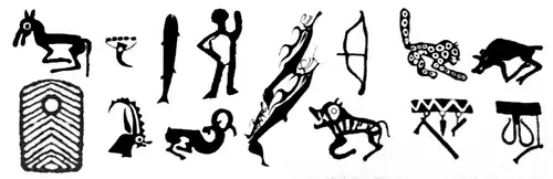 Some of the pictures on Deer stones, including a variety of animals and tools or weapons.