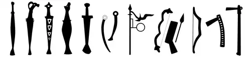 Depictions of weapons on Deer stones (Types II and III): double-bladed straight swords and daggers with round pommels, recurve bow, long-shaft axes.[49][50]
