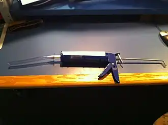 Caulking gun used for defecating proctogram