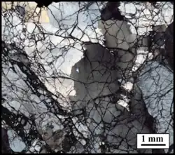 Cataclasis, or comminution, is a non-elastic brittle mechanism that operates under low to moderate homologous temperatures, low confining pressure and relatively high strain rates.[1][2][3] It occurs only above a certain differential stress level, which is dependent on fluid pressure[5] and temperature.[6] Cataclasis accommodates the fracture and crushing of grains, causing grain size reduction, along with frictional sliding on grain boundaries and rigid body grain rotation.[2][5][7] Intense cataclasis occurs in thin zones along slip or fault surfaces where extreme grain size reduction occurs.[1] In rocks, cataclasis forms a cohesive and fine-grained fault rock called cataclasite. Cataclastic flow occurs during shearing when a rock deform by microfracturing and frictional sliding where tiny fractures (microcracks), and associated rock fragments move past each other.[2][7] Cataclastic flow usually occurs at diagenetic to low-grade metamorphic conditions. However, this depends on the mineralogy of the material and the extent of pore fluid pressure.[2] Cataclastic flow is generally unstable and will terminate by the localization of deformation into slip on fault planes.[1][2]