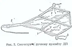 The snowshoe for the DP consists of metal plates hinged together with a stretched canvas fabric. Two of the plates, with eyelets and straps, are used to attach the bipod legs, while a canvas strap with buckle secures it to the trigger guard.
