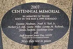 A memorial stands along a walking and bike path on Sooner Road and is dedicated to the seven people who lost their lives during the May 3 tornado.[36] United States Air Force Staff Sergeant James Day was killed in an ATV accident on May 8, 1999, while he was patrolling an area of Tinker AFB, Oklahoma, which had been damaged in the tornado. He is also listed on the memorial.[37]