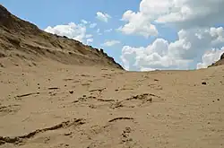 The Deliblato sands are an expanse shaped by Aeolian processes with significant dune-like relief made of powerful sandy deposits. It is a unique feature in this part of the world as the largest exemplar of the true sandy relief. Dunes are 70 to 200 m (230 to 660 ft) tall.[1] Southeast of the sands is the Kraljevac lake, one of the reservoirs formed around the edges of the region, in an effort to stop movement of the sand. There are floating peat islands on the lake's surface, where numerous waterfowl nest.[2]