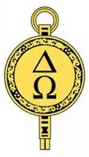 Delta Omega's emblem is a circular gold key with the Greek letters ΔΩ engraved vertically.[3] Its colors are black and gold. Its stole is peach, with a black binding and lettering.[4]