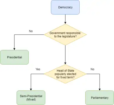 The first distinction made is whether a democracy's government is responsible to the legislature. If it is not responsible, it is a presidential democracy. If it is, then a further distinction is made between democracies where the head of state is popularly elected and those where the head of state is not popularly elected. If the head of state is popularly elected for a fixed term then, the democracy is mixed or semi-presidential. If the head of state serves for life or is not popularly elected or a fixed term, then the democracy is parliamentary.[1]