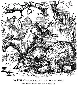 The most common mascot symbol for the party has been the donkey, or jackass.[127] Andrew Jackson's enemies twisted his name to "jackass" as a term of ridicule regarding a stupid and stubborn animal. However, the Democrats liked the common-man implications and picked it up too, therefore the image persisted and evolved.[128] Its most lasting impression came from the cartoons of Thomas Nast from 1870 in Harper's Weekly. Cartoonists followed Nast and used the donkey to represent the Democrats and the elephant to represent the Republicans.
