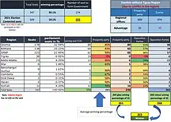 On 21 June 2021, parliamentary and regional elections were held under the country's unrest as well as the condition of COVID-19 pandemic.[35][36] Observers such as the African Union, the Eastern Africa Standby Force and necessarily the local Ethiopian civil societies did not informed the cases. The election were held in 436 parliamentary constituencies out of 547 with those 111 constituencies expected to held on 6 September including Benishangul-Gumuz, some parts of Western Oromia, Somali and Harari Region, and several zones in the Southern Nations, Nationalities, and People's Region due to irregularities and affected by fault in ballot paper.[37][38][39][40] The election was deemed a democratic improvement since past elections while NEBE faced considerable logistical challenges.[41][42] The Property Party landslide won 410 seats out of 436 in the federal parliament, exceeding his term into five years.[43][44][45][46]