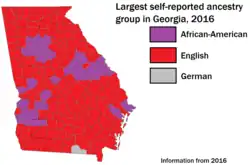 In the 1980 census, 1,584,303 Georgians cited that they were of English ancestry out of a total state population of 3,994,817 making them 40% of the state, and the largest ethnic group at the time.[18] Many people today who claim to have "American" ancestry are actually of English or Scots-Irish descent. However, due to the long-standing presence of their families in the region, often dating back to the colonial era, many prefer to identify solely as having "American" ancestry or may not be aware of their specific ancestral roots. Their ancestry primarily goes back to the original Thirteen Colonies and for this reason many of them today simply claim "American" ancestry, though they are of predominantly English ancestry.[19][20][21][22]