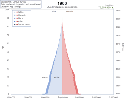 In 1900, when the U.S. population was 76 million, there were 66.8 million white Americans in the United States, representing 88% of the total population,[40] 8.8 million Black Americans, with about 90% of them still living in Southern states,[41] and slightly more than 500,000 Hispanics.[42]