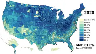 Population growth is fastest among minorities as a whole, and according to a 2020 U.S. Census Bureau analysis, 50% of U.S. children under the age of 18 are now members of ethnic minority groups.[32] As of 2020, white Americans numbered 235,411,507 or 71% of the population, including people who identified as white in combination with another race. People who identified as white alone (including Hispanic whites) numbered 204,277,273 or 61.6% of the population, while non-Latino whites made up 57.8% of the country's population.[33]