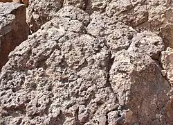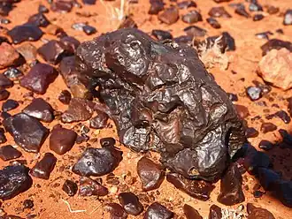 Desert varnish or rock varnish is an orange-yellow to black coating found on exposed rock surfaces in arid environments. Desert varnish is approximately one micrometer thick and exhibits nanometer-scale layering.[1] Rock rust and desert patina are other terms which are also used for the condition, but less often.