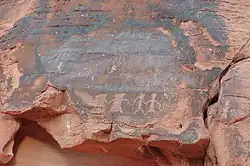 Petroglyphs carved in desert varnish at the Valley of Fire near Las Vegas, Nevada. Area shown is about one metre across.