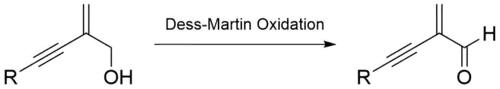 One example of the Dess–Martin oxidation involves transforming a sensitive α-β-unsaturated alcohol to its corresponding aldehyde. This moiety has been found in several natural products and due to its high functionality, it could be a valuable synthetic building block in organic synthesis. Thongsornkleeb and Danheiser oxidized this sensitive alcohol by employing the Dess Martin Oxidation and altering the work up procedure (diluting with pentanes, washing with poly(4-vinylpyridine) to remove the acetic acid generated during the reaction, filtering and concentrating via distillation.[12]