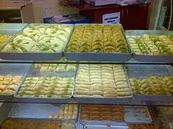 Baklava, a pastry comprising layers of filo with chopped nuts, sweetened and held together with syrup or honey
