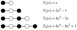 An important family of examples of Shabat polynomials are given by the Chebyshev polynomials of the first kind, , which have −1 and 1 as critical values. The corresponding dessins take the form of path graphs, alternating between black and white vertices, with edges in the path. Due to the connection between Shabat polynomials and Chebyshev polynomials, Shabat polynomials themselves are sometimes called generalized Chebyshev polynomials.[9][10]