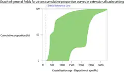 Detrital zircon geochronology has become increasingly popular in geological studies from the 2000s mainly due to the advancement in radiometric dating techniques.[1][2] Detrital zircon age data can be used to constrain the maximum depositional age, determine provenance,[3] and reconstruct the tectonic setting on a regional scale.[4]