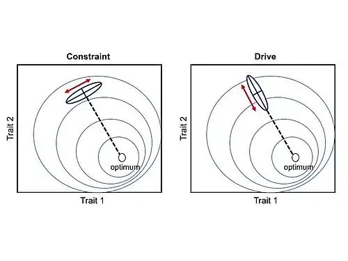 A general consequence of the P-matrices and G-matrices is that evolution will tend to follow the ‘path of least resistance’. In other words, if the main axis of variation is aligned with the direction of selection, covariation (genetic or phenotypic) will facilitate the rate of adaptive evolution; however, if the main axis of variation is orthogonal to the direction of selection, covariation will constraint the rate of adaptive evolution.[2][12][25] In general, for a population under the influence of a single fitness optimum, the rate of morphological divergence (from an ancestral to a new phenotype or between pairs of species) is inversely proportional to the angle formed by the main axis of variation and the direction of selection, causing a curved trajectory through the morphospace.[34]