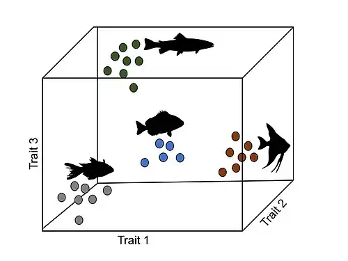 Multidimensional representation of species in the morphospace. Each axis corresponds to a trait, and dots correspond to organisms with particular trait values combinations. In this case, the axes represent the form of the fish species.