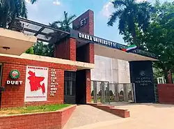 Dhaka University of Engineering & Technology, Gazipur (Bengali: ঢাকা প্রকৌশল ও প্রযুক্তি বিশ্ববিদ্যালয়, গাজীপুর), commonly known as DUET, formerly BIT Dhaka, is a public engineering and technological research university in Gazipur, Bangladesh,[3][4] which focuses on the study of engineering and architecture. DUET is one of the top Engineering PhD granting research universities of Bangladesh along with BUET, CUET, KUET, RUET.[5] The university requires diploma engineers candidates, graduated from polytechnic institutes or technical schools affiliated by the Bangladesh Technical Education Board for under-graduation enrollment.