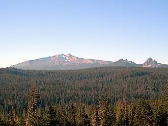 Diamond Peak forms part of the central arc of the Cascade Volcanoes,[20] and it joins several other volcanoes in the eastern segment of the Cascade Range known as the High Cascades.[21] Formed towards the end of the Pleistocene epoch, these mountains are underlain by more ancient volcanoes that subsided due to parallel north–south faulting in the surrounding region.[22] The High Cascades consist mostly of Pleistocene volcanoes constructed on top of upper Cenozoic lava flows and volcanic vents (produced within the last 15 million years), with compositions varying from homogenous, mafic lava flows (rich in magnesium and iron) and pyroclastic rocks to lava more enriched with basalt and rhyodacite.[21]