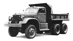 The dump had a 12 feet (3.7 m) long 4 cubic yards (3 m3) steel body that was raised and lowered by a hydraulic cylinder and lever arrangement under the body. A power take-off on the transfer case, used with the transmission in gear, drove the hydraulic pump, the controls were inside the cab. The body had a tailgate that hinged from either the top or bottom. When the tailgate was hinged at the top the bottom could be opened while dumping with a lever on the left front corner of the body, just behind the driver's window. The front of the body had a stone-shield that covered the cab and the spare tire mounted between the cab and body.[26][27]