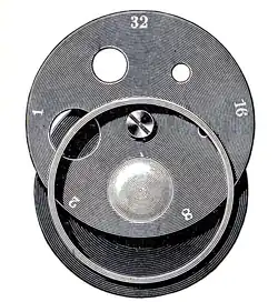 An iris diaphragm can reduce the amount of light that hits a detector by decreasing the aperture, usually with "leaves" or "blades" that form a circle.[2]