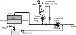 Fluids, commonly known as slurry, often consists of a mixture of particles varying in size which can not be efficiently filtered out by the main D.E. filter. Build up of such particles can increase pressure which results in reduced flow of liquid and a nonfunctional filter. To prevent this, the filtration process can include additional filter aid to distribute certain particles to prevent any problems that hinder the filtration process.[14] Filter aid are solid particles that can improve the permeability and porosity to improve filtrate clarity by trapping specific sized particles while allowing continuous flow of liquids. When filter aid builds up it has a high porosity; although the volume may accumulate, approximately fifteen percent of the total volume is solid, which leaves the rest to be empty space.[15] These filters can serve as a precoat that is applied prior to the filtration process. It is pumped through the filter press, simultaneously creating a porous filter cake on the specified filter cloths. Body feed is an additional filter aid which is often pumped throughout the whole filtration process to improve clarification and prevent build up of filter cake. Build up the filter cake can be detrimental as it becomes impermeable and can block the continuous flow of slurry. Usually, body feed is coarse and has a greater volume, which can assist filter cake build up while allowing particles to be efficiently removed.[16] The pre-coat tank and body feed tank generally serve the same purpose which is to filter out larger particles that can impede the filtration process. Depending on the purity of the initial slurry, the quantity needed of either the body feed or pre-coat can vary.