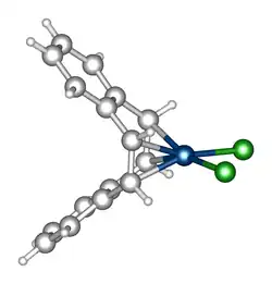Structure of PtCl2(DBCOT). Color code: dark blue=Pt, gray = C, green = Cl.[3]