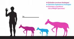 The Xiphodontidae is characterized by its species being very small to medium in size. Speciose xiphodonts such as Dichodon and Haplomeryx tended to have displayed evolutionary increases in size. Unlike Xiphodon with a consistent medium size range and Haplomeryx with a very small to small size range, Dichodon included small to medium sized species.[17] The larger-sized species compose of D. cervinum, D. cuspidatum, D. stehlini, and D. biroi while the others, namely D. frohnstettensis, D. simplex, D. subtilis, D. cartieri, D. lugdunensis, and D. ruetimeyeri, are smaller-sized.[31][16] The M2 of the smaller-sized D. lugdunensis, for instance, measures 7 mm (0.28 in) long and 7.7 mm (0.30 in) wide.[17] In comparison, the dentition of D. stehlini is very large based on M2 measuring 13 mm (0.51 in) long and 14 mm (0.55 in) wide, attesting to the gigantism of it and D. cuspidatum compared to other species. The two very large species were probably offshoots appearing at later points of time that did not last long,[13][31] as evident by their restricted single localities.[17][35]