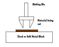 Dinking is a manufacturing process. Dinking uses special dies called dinking dies, which are hollow cutters. The edges of the dies are usually beveled about 20° and sharpened. The material is punched through into a wood or soft metal block in order to not dull the edges.[7] The die may be pressed into the material with a hammer or a mechanical press.[4][8]