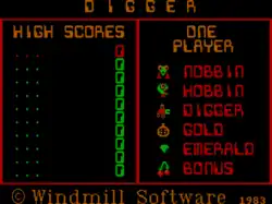 Features of Digger are similar to those in the arcade games Mr. Do! and Dig Dug. The player is placed in an underground maze and can dig horizontal and vertical tunnels through it. At least one tunnel already exists at the start of play. At various points on the board are emeralds (usually in clusters) and bags of gold. Monsters (initially in the "nobbin" form) appear at the top-right corner. If earth is excavated from under a gold bag, then the bag will wobble for a few seconds and then drop; if it falls more than one row, it will break open after falling, releasing gold, which can be collected. Bags can be pushed left or right into vertical paths, with similar results. Falling bags will squash monsters, but they will also squash the digger. The digger has a weapon, which fires in a straight line, but takes several seconds to recharge (taking longer as the levels go higher).