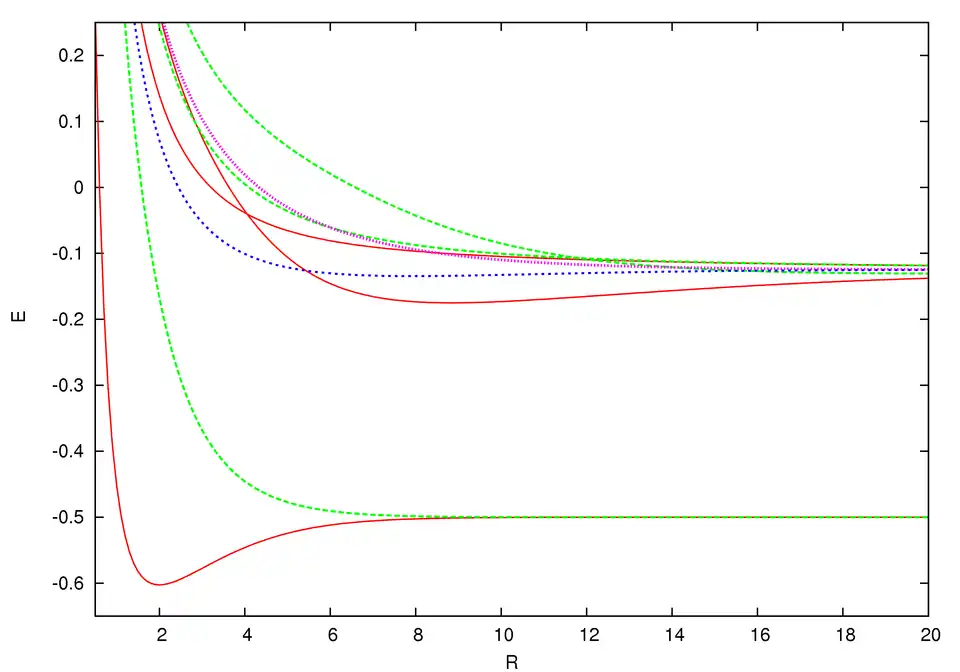 as a function of internuclear distance (R, in Bohr radii, the atomic unit of length). See text for details.